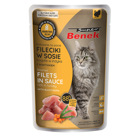 Super Benek Mokra Karma Dla Kota 85g Bezzbożowe Fileciki Gotowane na Parze Indyk z Rokitnikiem w Sosie